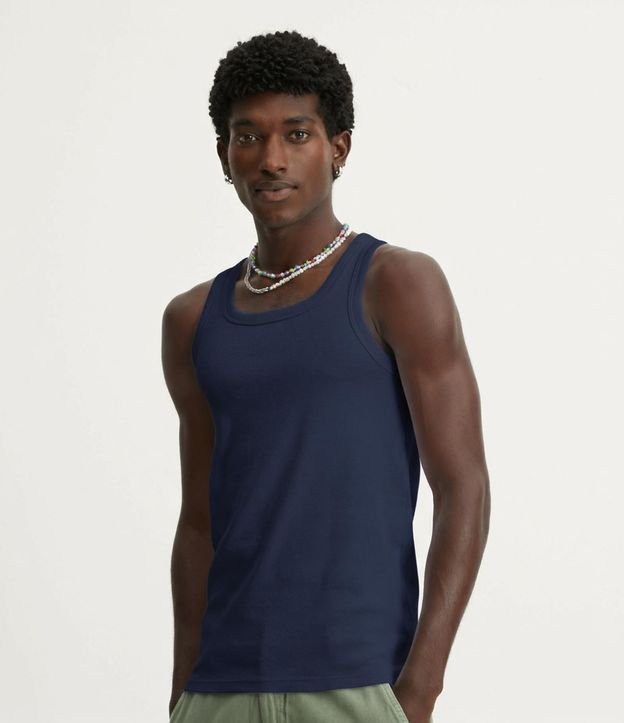 Regata regular masculina confeccionada em malha ribana de algodão, básica e sem estampa. Possui alças médias e comprimento alongado.