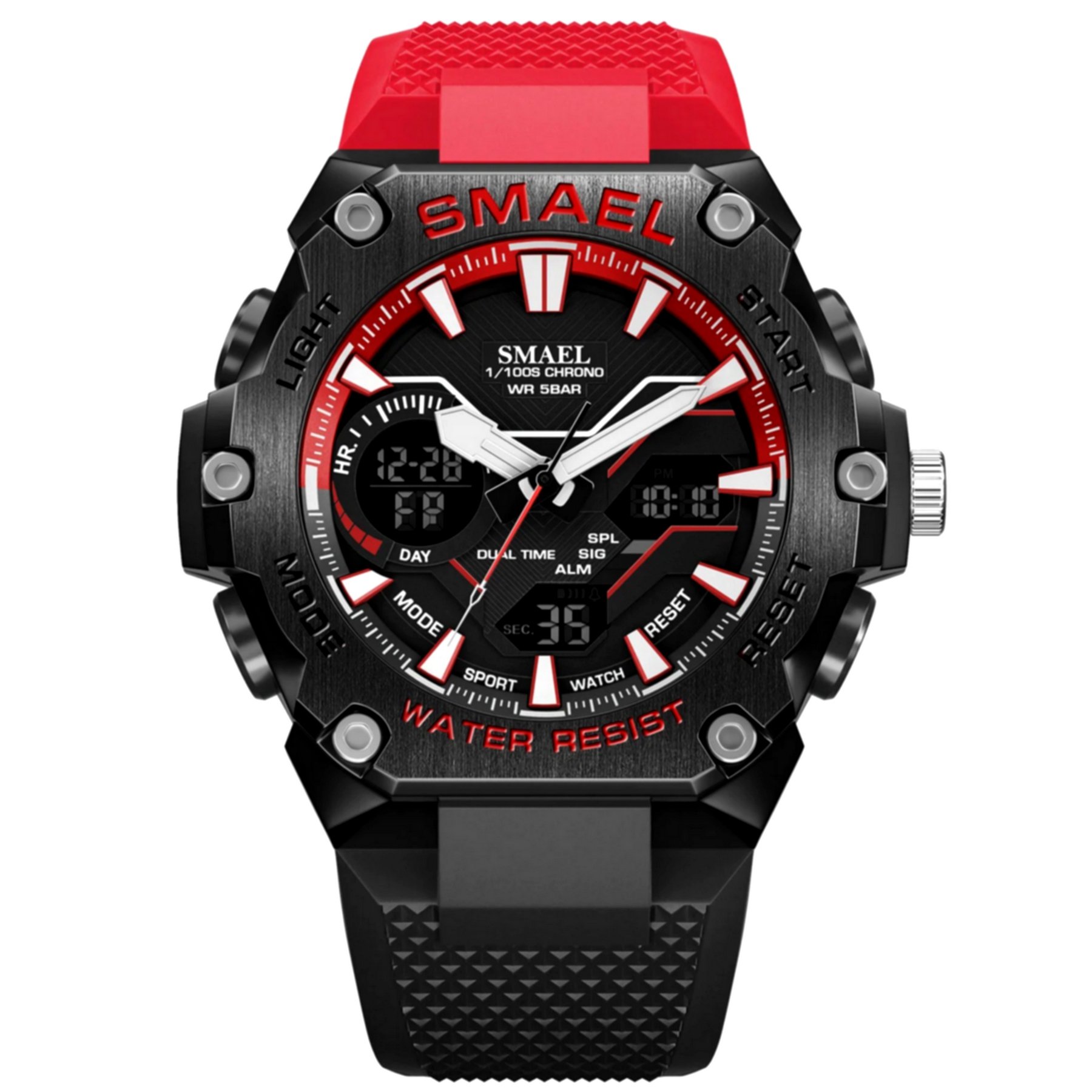 Alem da sua aparencia chamativa e contemporanea, o relogio apresenta uma impressionante resistencia a agua de ate 5bar, permitindo que voce o use em atividades aquaticas sem preocupacoes. Com um mostrador com 55mm de diametro e espessura de 18mm, ele e imponente e facil de ler. Completo com funcionalidades como luz de fundo, resistencia a choques e um calendario completo, ele se torna nao apenas uma peca de moda, mas um companheiro no seu cotidiano movimentado.