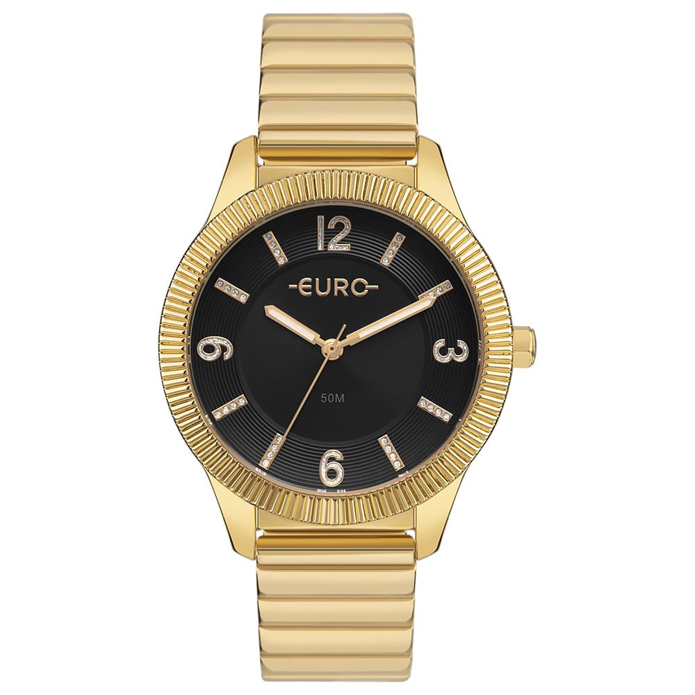 Com opções super diferenciadas, a coleção Glitz traz modelos fazem a diferença para mulher Euro. Relógio com aro corrugado em banho dourado e pulseira de link único.