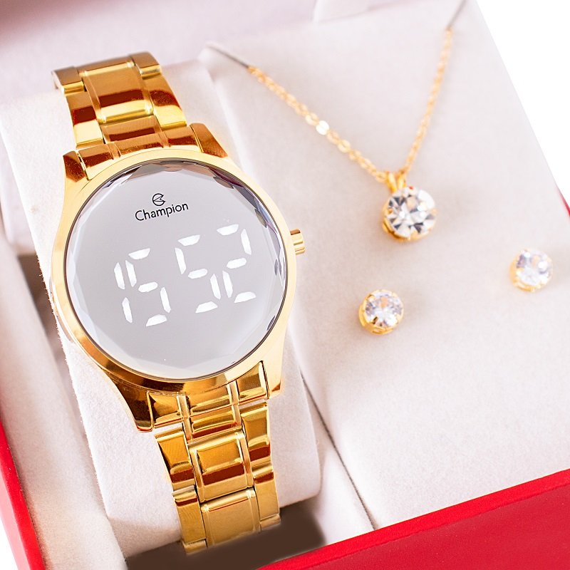 Relógio Feminino Champion Dourado Espelhado Digital CH48019B Kit Colar e Brincos