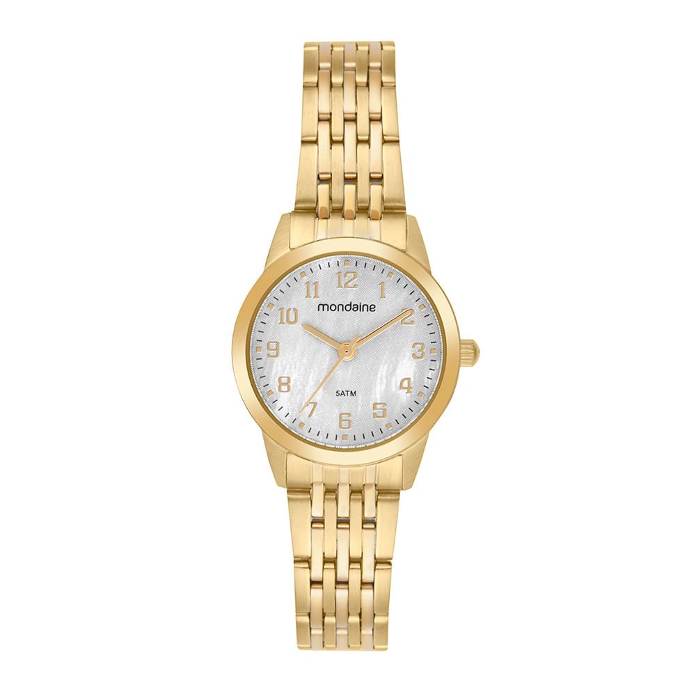 O mostrador madrepérola com números completos garante beleza e fácil leitura.