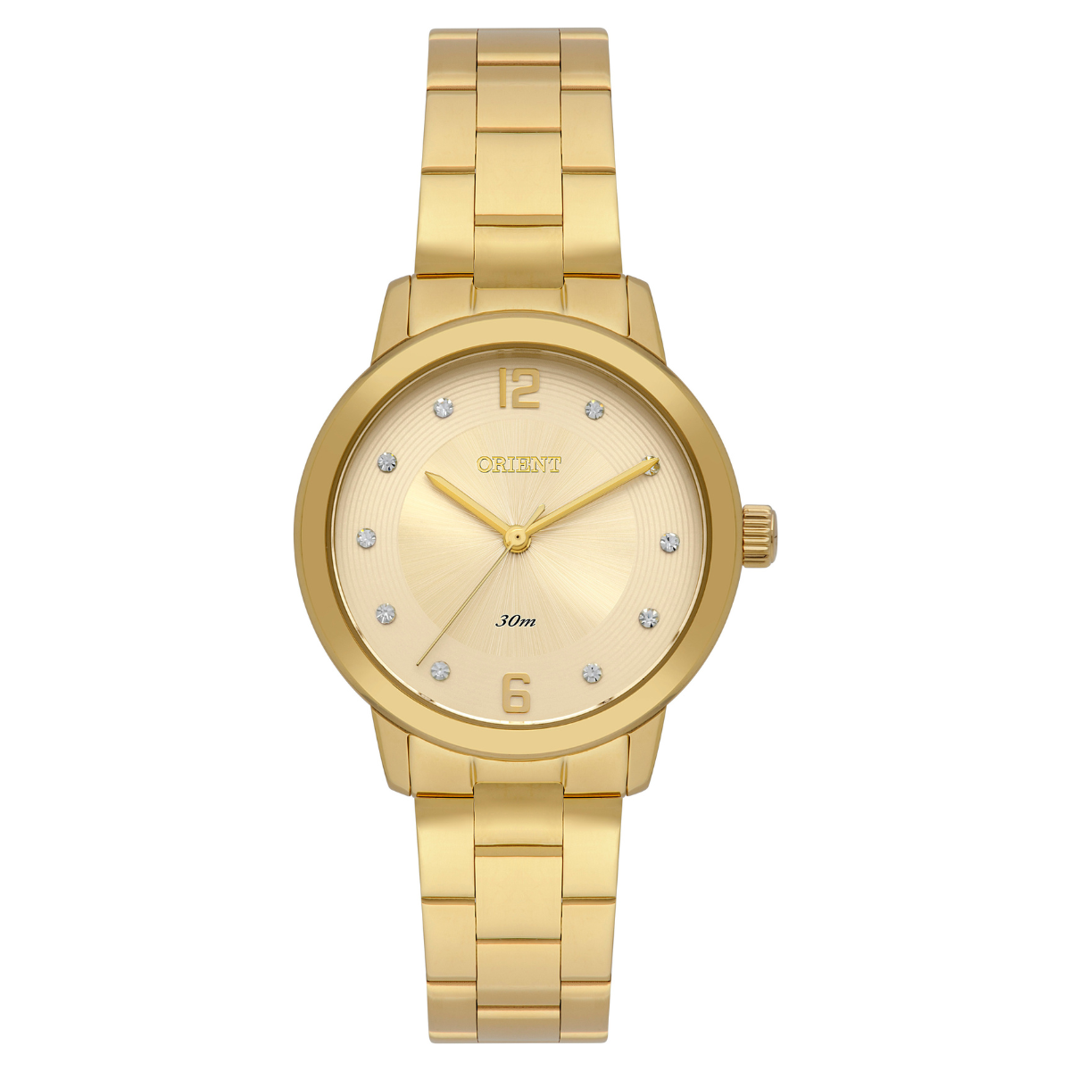 Cor do mostrador: Dourado, mostrador sunray com grafismos geométricas e cristais austríacos.