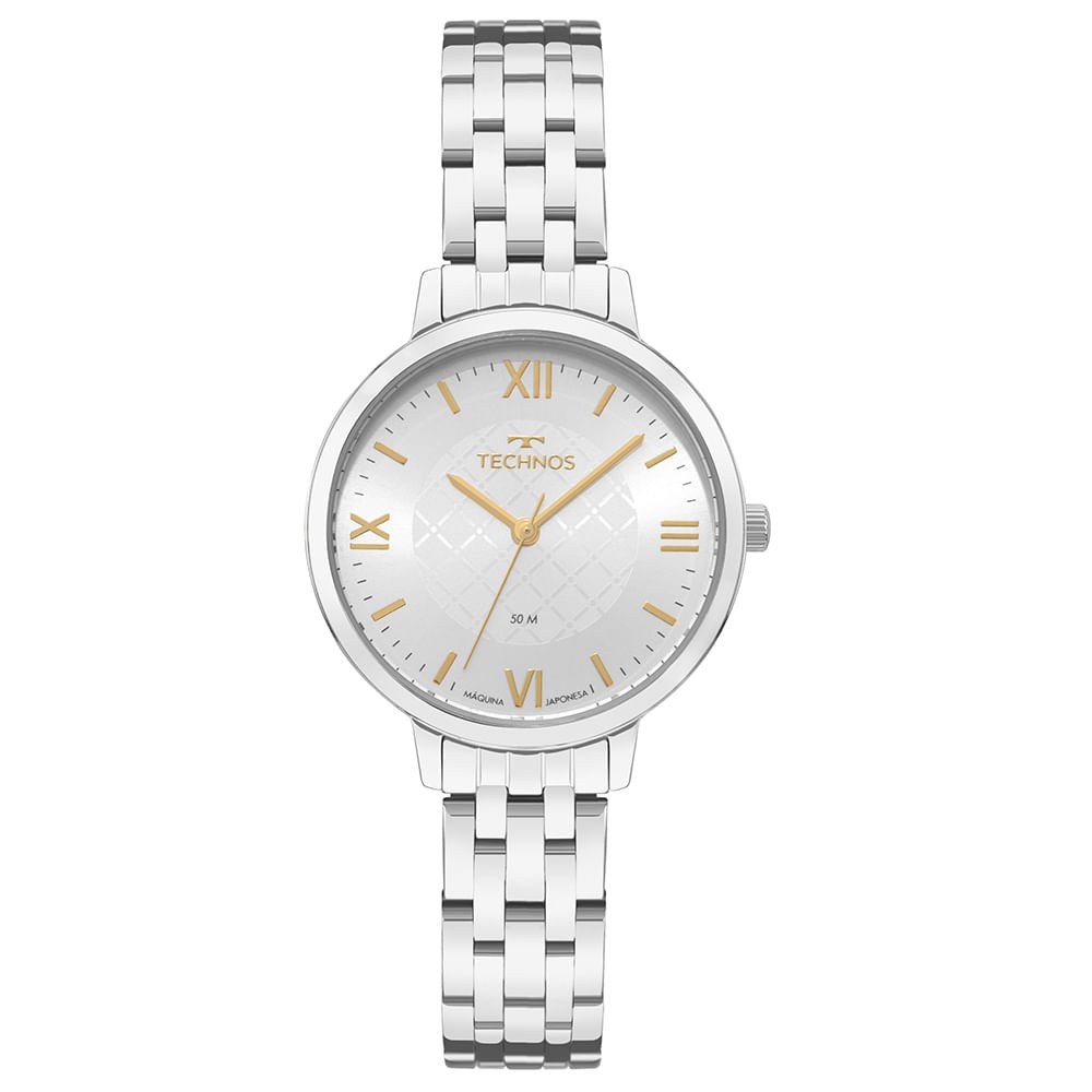Relógio Technos Boutique permanece impressionando com seu novo modelo de design clássico, que conta com mostrador texturizado de fácil leitura na cor prata e numeração romana, tornando o produto ainda mais sofisticado. Produto 100% em aço inoxidável, banhado em prata, com resistência à água de 50 metros e pulseira de aço inoxidável em 5 links.