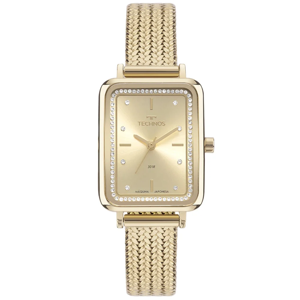 Relógio Technos Mini em uma nova versão de modelo best-seller com caixa retangular. Delicado e com uma pulseira de mesh de textura diferenciada, ele apresenta um mostrador que conta com aplicação de pedras nos marcadores de hora e em todo o aro interno. Produto 100% em aço inoxidável, com máquina quartz Japonesa Miyota e resistência à água de 30m.