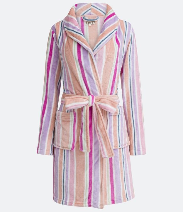 Robe Curto em Fleece com Amarração na Cintura e Estampa Listrada