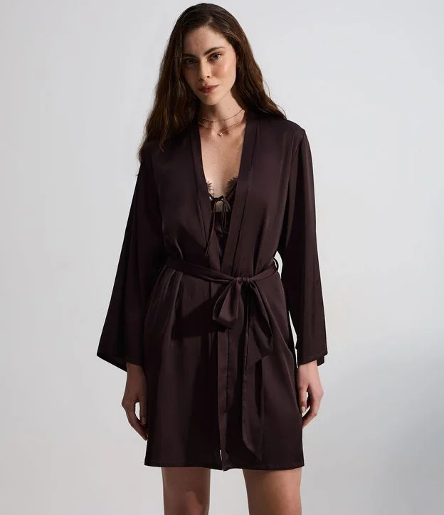 Robe feminino confeccionado em poliéster certificado Grs, possui tecido acetinado de acabamento brilhante, caimento leve e mangas amplas, modelagem com gola ampla, amarração na cintura e laço volumoso.