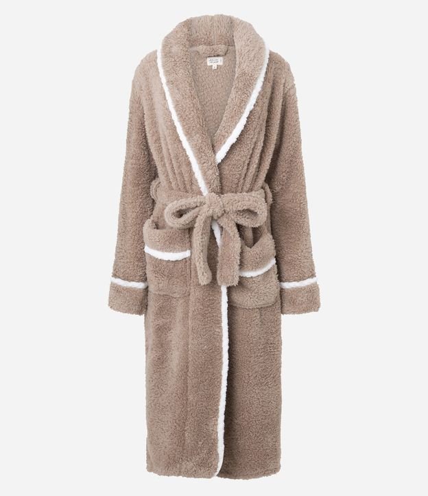 Robe feminino em sherpa confeccionado em poliéster mais sustentável. Possui modelo com magas longas, bolsos frontais, amarração na cintura e viés contrastantes. Ideal para se manter aquecido e confortável.