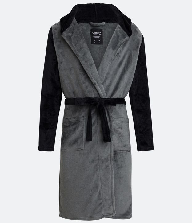 Roupão em Fleece com Capuz e Amarração Cinza/Preto
