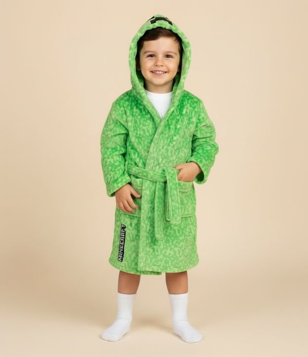 Roupão infantil em fleece com estampa do jogo Minecraft e capuz interativo com detalhe do personagem Creeper. Modelo com mangas longas, faixa para amarração e toque macio. Confeccionado em poliéster certificado GRS e boas práticas ambientais, garantindo conforto e diversão.