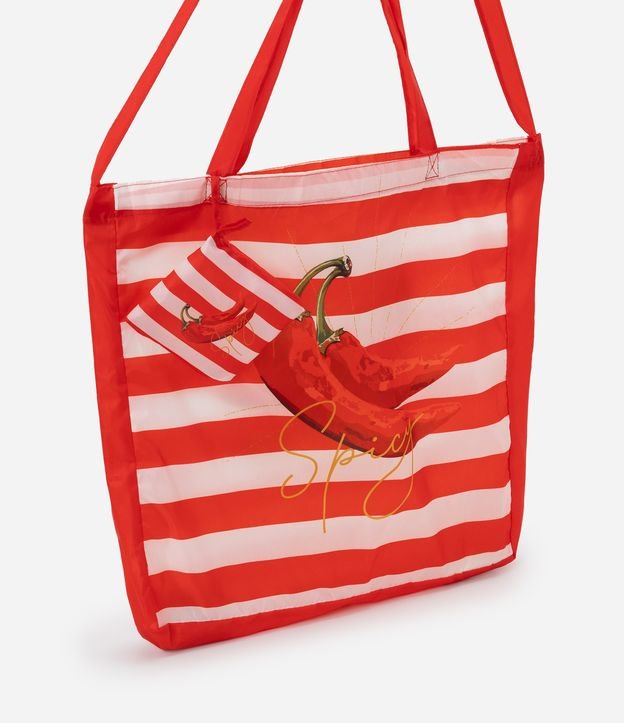 Sacola dobrável com alça dupla, estampa listrada com pimentinhas centralizadas e a lettering spicy.
