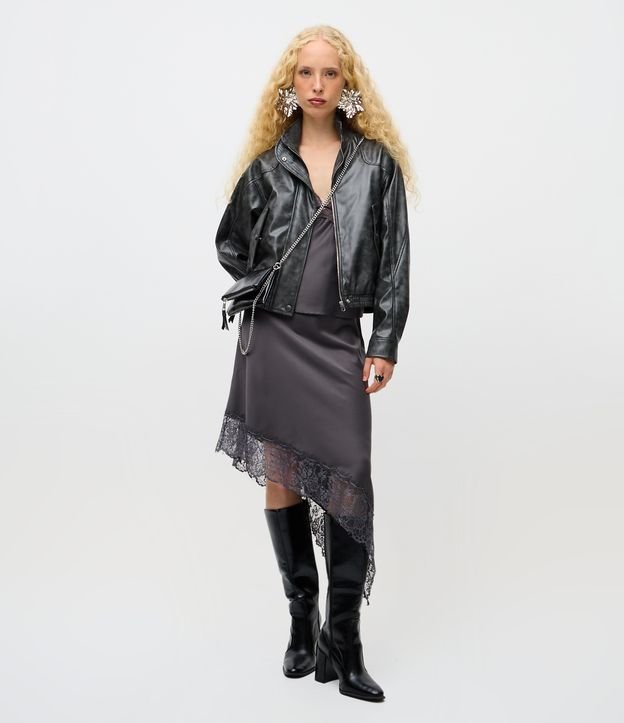 Saia Acetinada Assimétrica com Renda na Barra Cinza