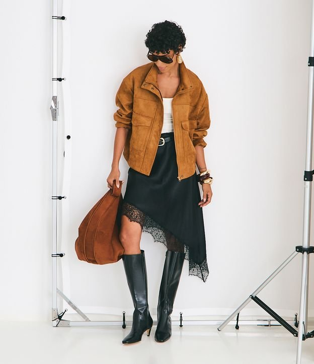 Saia curta em cetim com caimento leve, barra assimétrica e aplicação de renda, trazendo um toque sofisticado ao visual. Ideal para compor produções modernas para festas e momentos especiais, valorizando brilho e movimento em cada look.