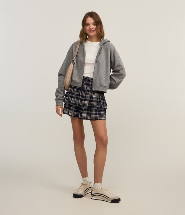 Saia curta confeccionada em chalis, com cós elástico e cordinha para ajustes. Peça com estampa xadrez e barra dupla com babados.