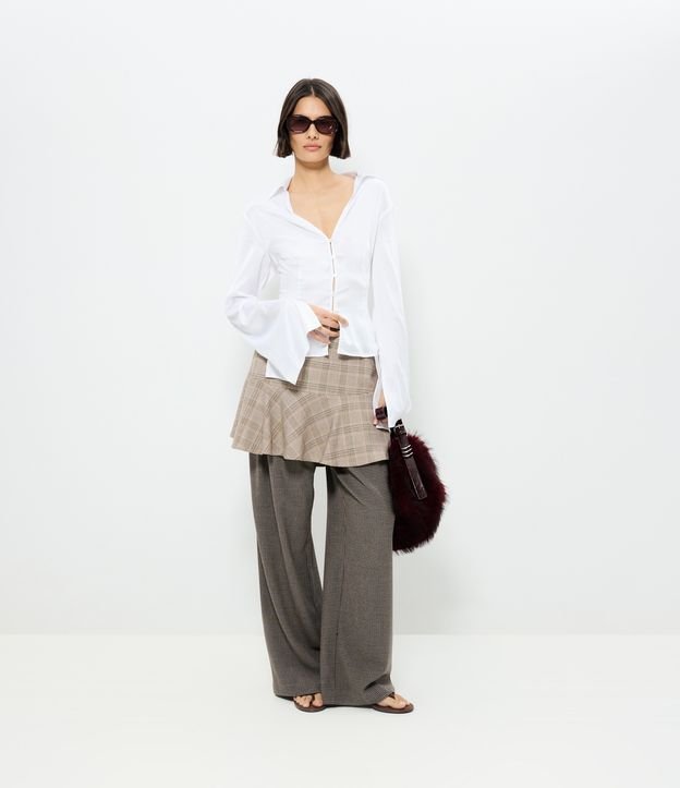 Saia feminina curta em flanela com estampa xadrez e detalhe de babado que adiciona movimento ao visual. Possui caimento estruturado e fechamento posterior, ideal para compor produções modernas com toque clássico, confeccionada em viscose certificada.