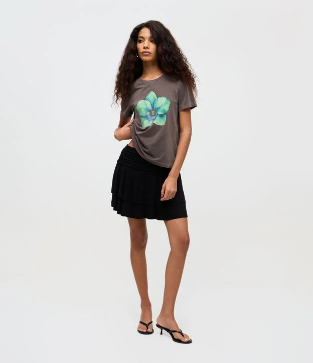 Saia curta em suede com modelagem evasê e camadas de babados que criam movimento delicado. Possui cós largo estruturado e caimento confortável, ideal para compor produções modernas. Peça versátil para o dia a dia, com toque macio e acabamento elegante.