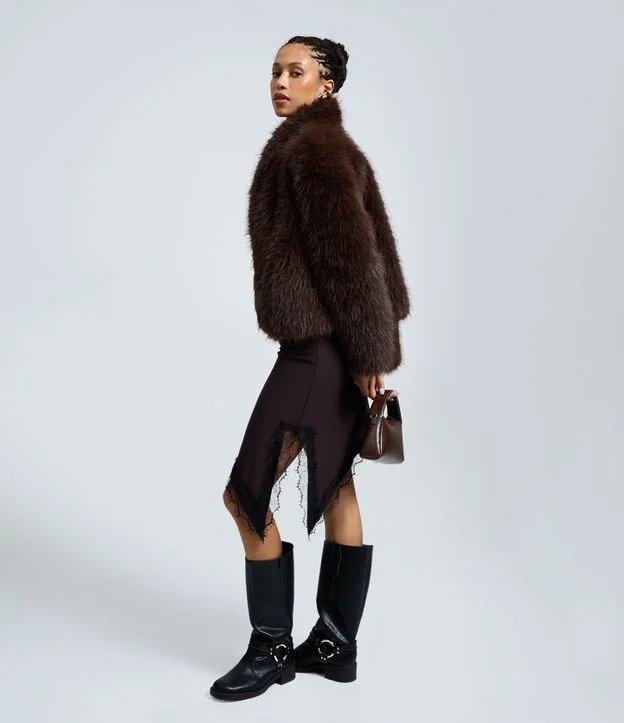 Saia em Crepe com Barra Assimétrica Rendada Marrom
