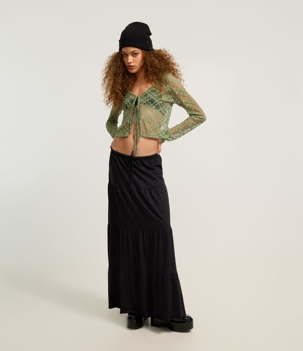 Saia evasê com cós elástico, confeccionada em algodão bci mais sustentável e babado na barra.