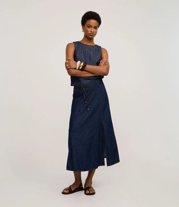 Saia feminina confeccionada em jeans, com modelagem evasê e comprimento abaixo do joelho. Possui cinto diferenciado que adiciona charme ao visual e fenda frontal para um toque moderno. Peça confeccionada em algodão de certificado BCI, garantindo processo mais sustentável.