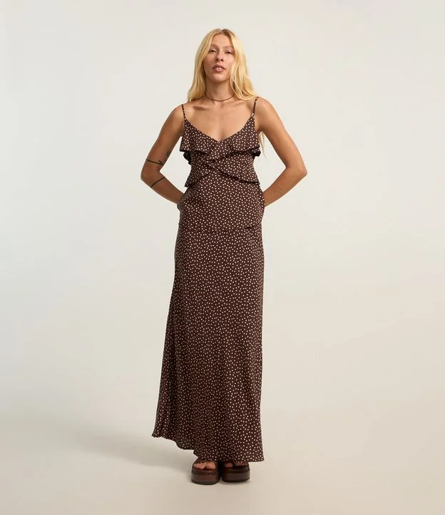 Saia Evasê Long Midi em Twill Poá Marrom