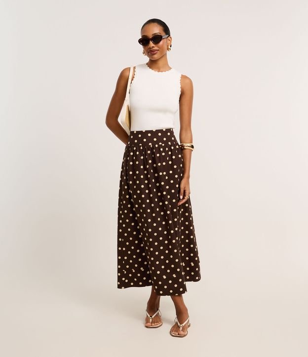 Saia Evasê Midi em Cotton com Lastex no Cós e Estampa Poá Marrom