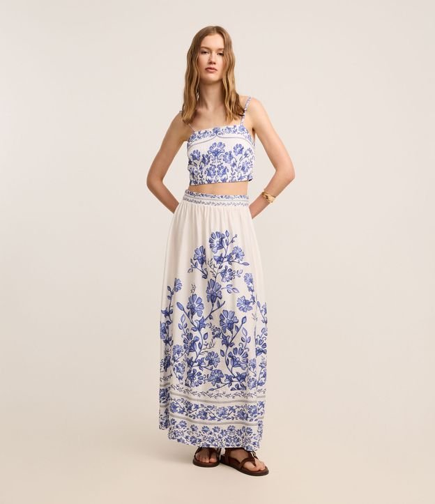 Saia evasê midi, confeccionado em viscose, com elástico na cintura. A peça tem estamparia de flores que remetem às ilustrações de azulejos lusitanos. Este produto possui viscose certificada em sua composição, além de ter sido produzido através de processos mais sustentáveis com boas práticas ambientais, sendo ambientalmente mais responsável.