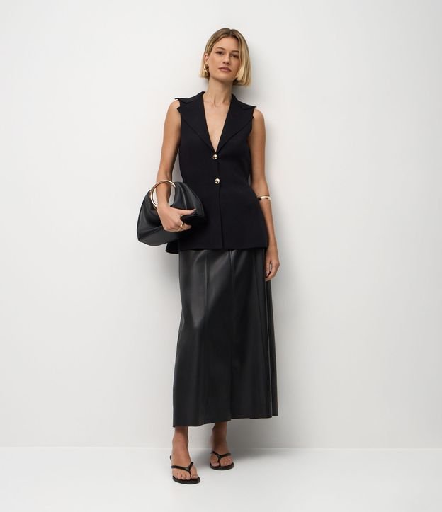 Saia Evasê Midi em PU com Passantes e Lapelas Frontais Preto