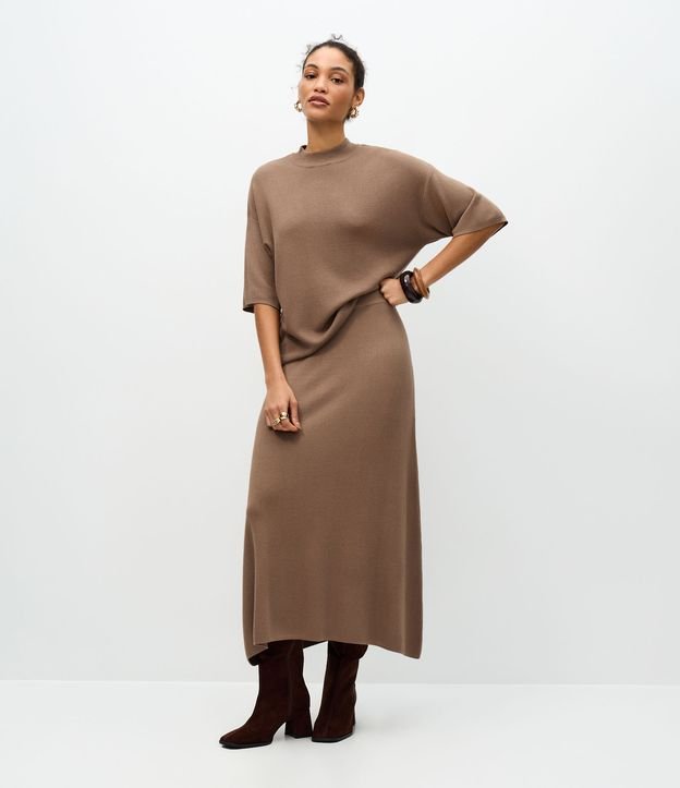 Saia Evasê Midi em Tricô com Caimento Leve Bege