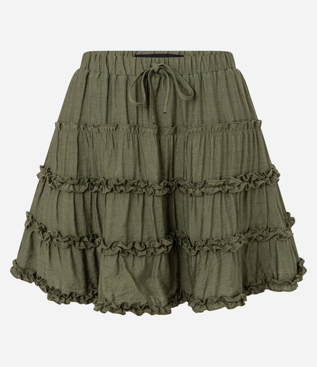 Saia feminina confeccionada em viscose certificada no modelo godê curta com cós elástico, amarração e babadinhos.
