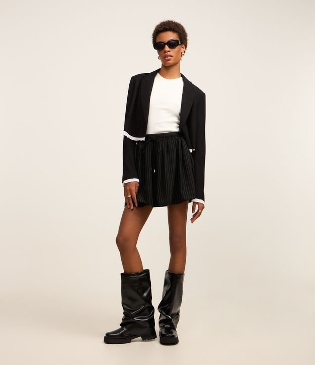 Saia mini em alfaiataria, godê com cós sobreposto, cordão para ajuste e listras contrastantes.