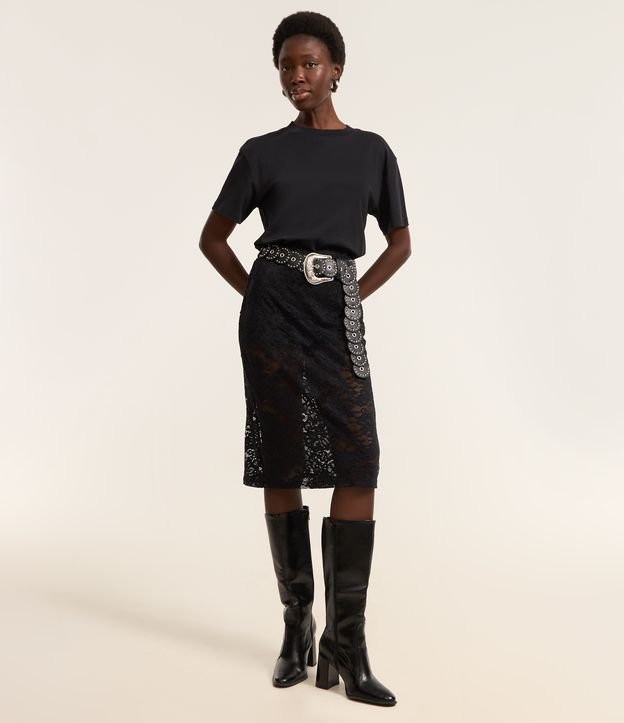 Saia Lápis Midi em Renda Floral com Forro Preto