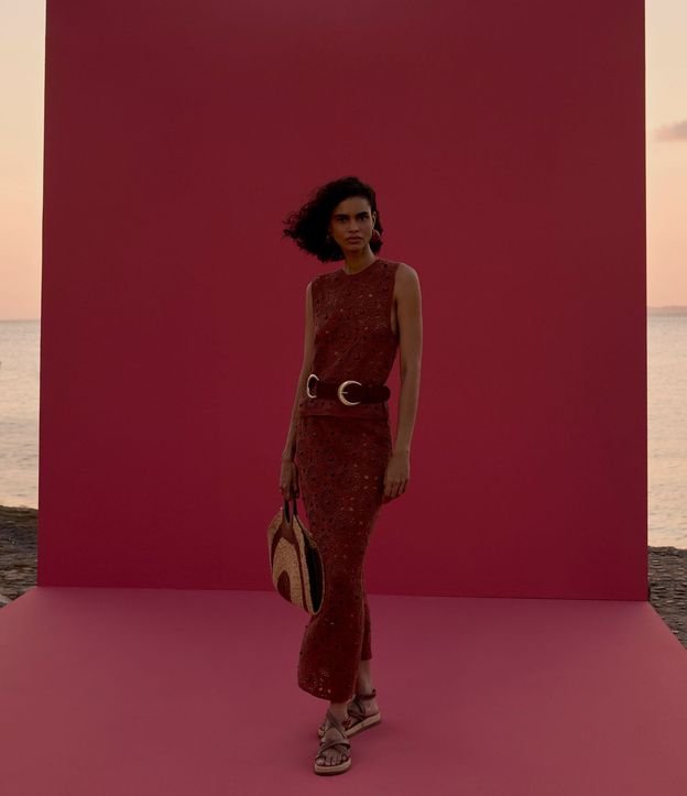 Saia reta long midi de cintura alta, confeccionada em tricô, com mix de pontos em efeito crochê e miçangas aplicadas. Este produto possui viscose certificada em sua composição, sendo ambientalmente mais responsável.