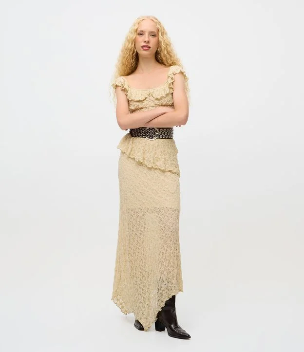 Saia Long Midi em Renda com Barra Assimétrica Bege
