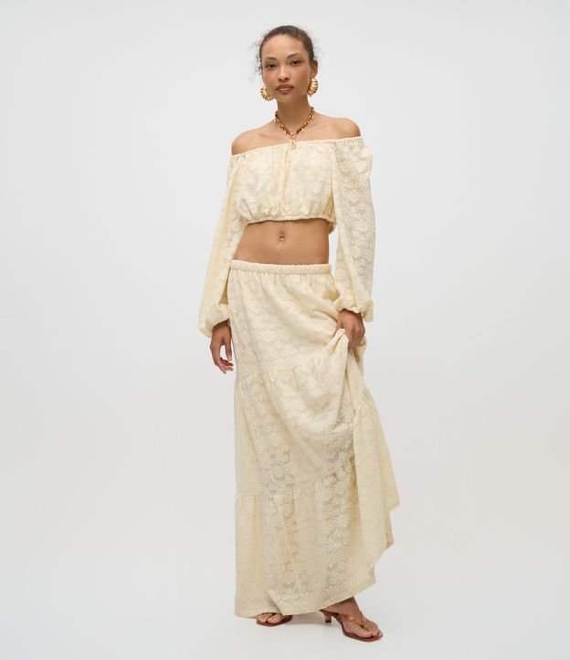 Saia Longa em Jacquard Floral com Babados Bege