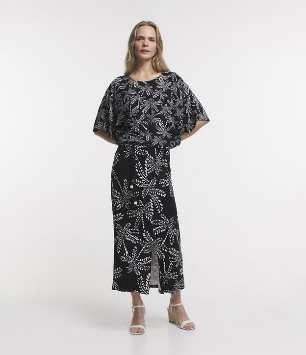 Saia Longa em Moletinho com Fenda Central e Folhagem Estampada