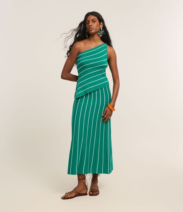 Saia feminina de modelo longo, confeccionada em tricô de material mais sustentável. Possui cós largo com elástico e estampa listrada.