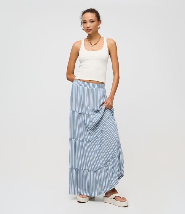 Saia Longa em Viscolinho com Estampa de Listras e Marias Azul