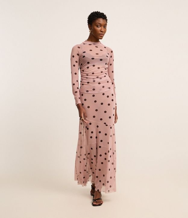 Saia Longa Evasê em Tule com Estampa Poá e Recortes Assimétricos Rosa
