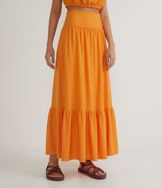 Saia Midi com Detalhes Trançados no Cós e Babado na Barra