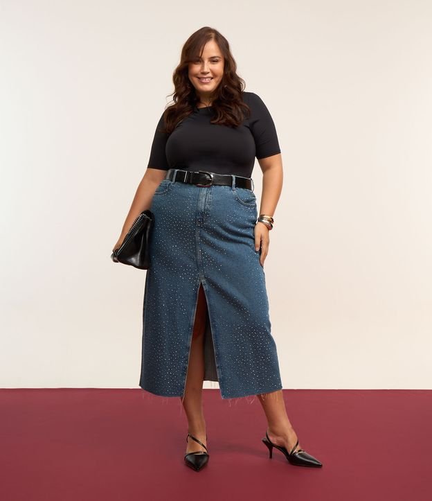 Saia Midi em Jeans com Brilhos e Fenda Curve & Plus Size