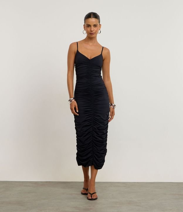 Saia midi drapeada, confeccionada em poliamida e cós elástico.