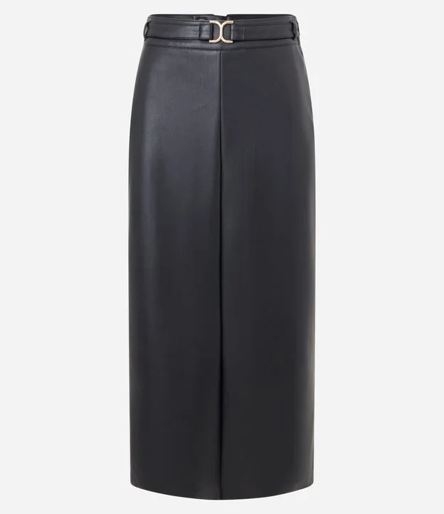 Saia Midi em PU com Cinto Afivelado e Fenda Atrás Preto