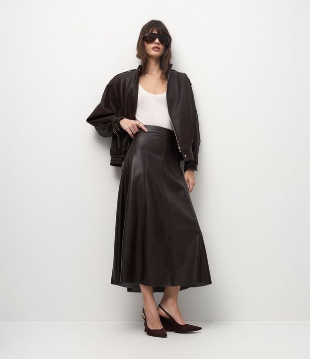 Saia Midi em PU com Recortes Frontais Marrom Escuro