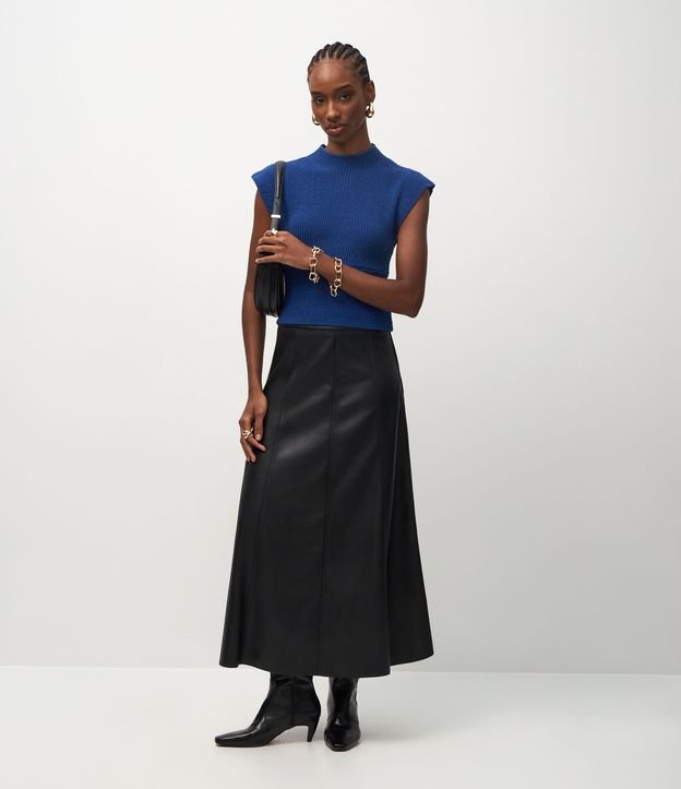 Saia feminina midi em PU com recortes frontais bem marcados e cós liso estruturado.