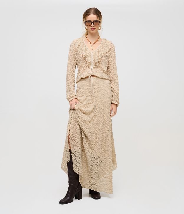 • Saia Midi em Renda Texturizada com Barra Assimétrica Bege Claro 1