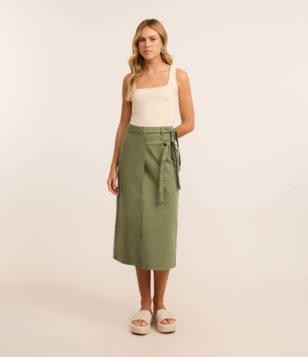 Saia Midi em Sarja Cruzada com Cintos de Amarração na Lateral Verde