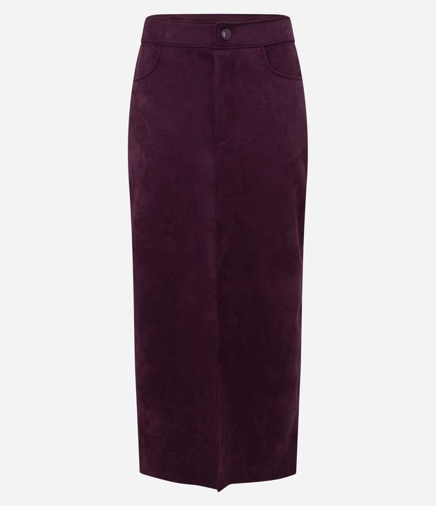 Saia feminina midi em suede, com textura aveludada e caimento estruturado. Possui cós com botão frontal, bolsos curvos e recorte central que alonga a peça.