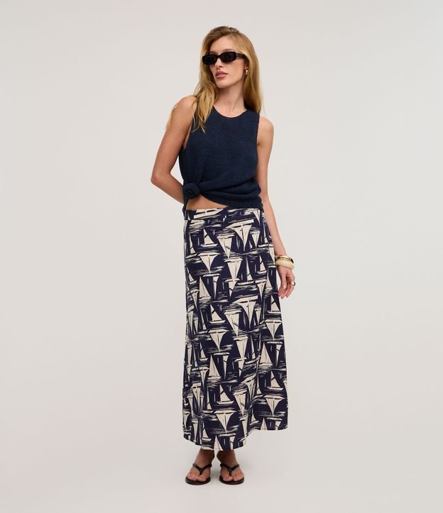 Saia Midi em Viscolinho com Estampa Náutica e Cós Elástico Azul