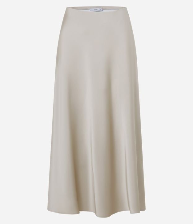 Saia midi evasê feminina, confeccionada em tecido acetinado, com superfície sem estampa.