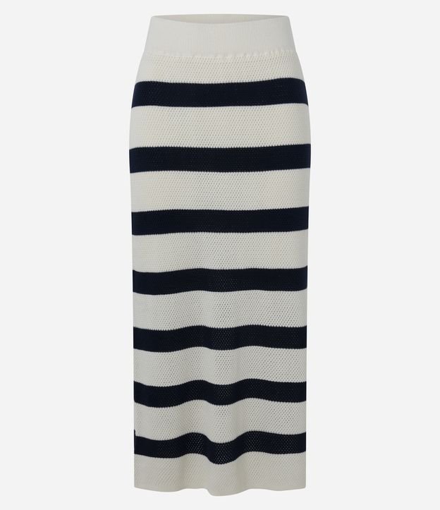 Saia Midi Listrada em Tricô com Fenda na Barra Azul Marinho/Off White