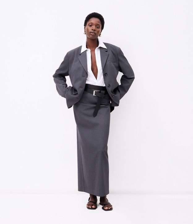 Saia Midi Reta com Corte Alfaiatado e Fenda Cinza